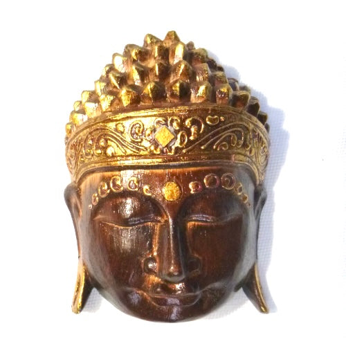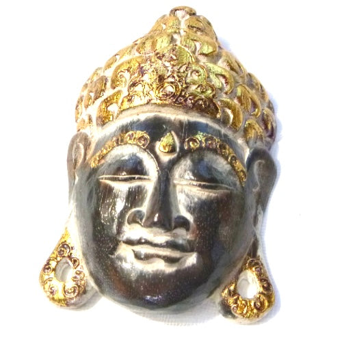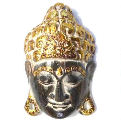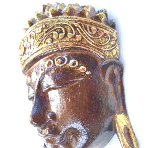 Spectacular wood carved and hand painted Buddha face in Albezia wood. Imported from Bali, Indonesia.